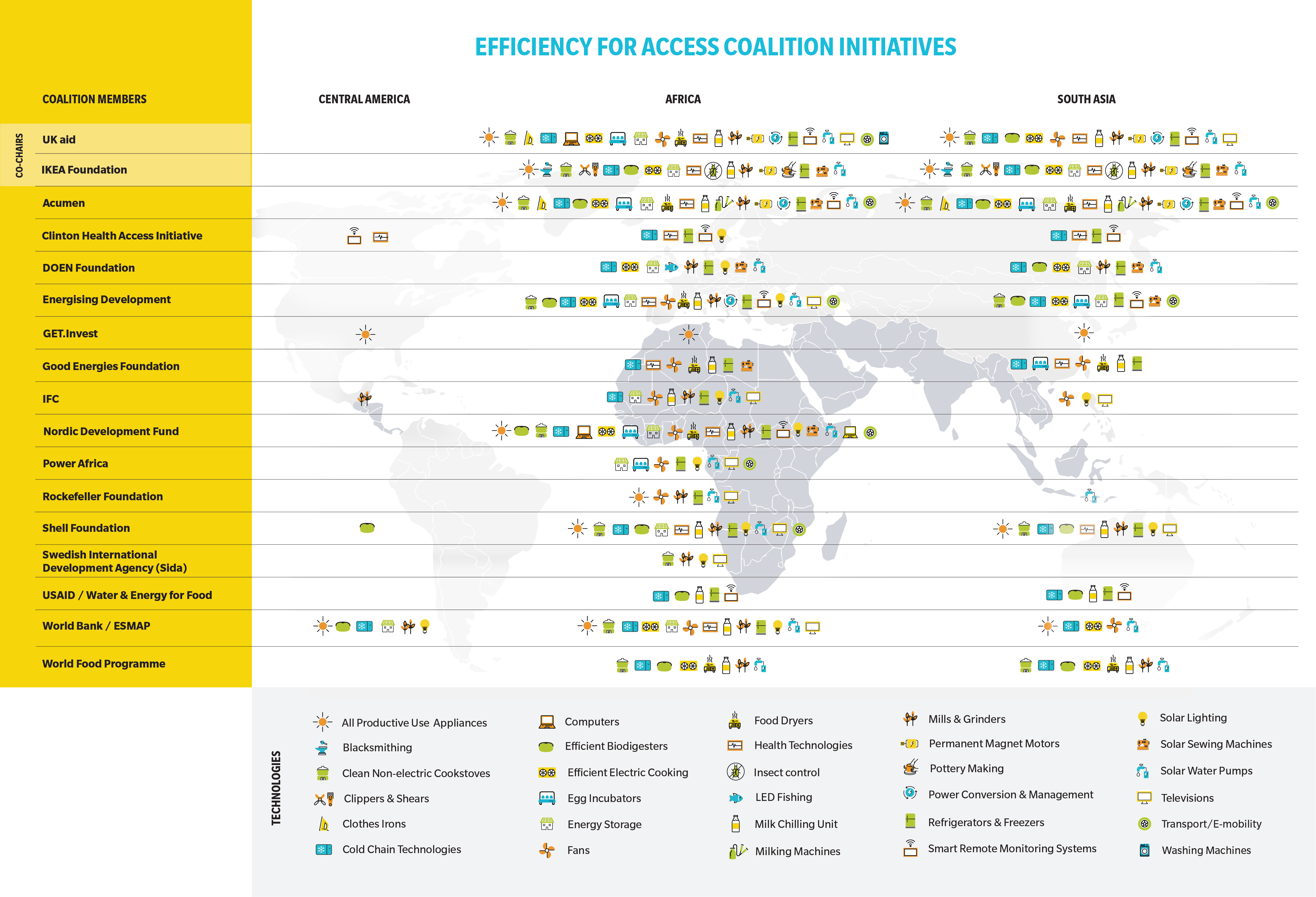 Efficiency for Access consists of 20 Donor Roundtable Members, 19 Programme Partners, and 34 Investor Network members. Current Efficiency for Access Coalition members have programmes and initiatives spanning 62 countries and 34 key technologies.